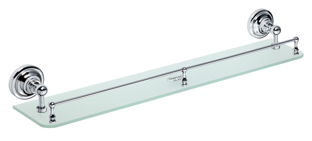 Półka szklana z relingiem wykonana z mosiądzu, pokryta chromem w wykończeniu chrom połysk. Szkło mleczne.