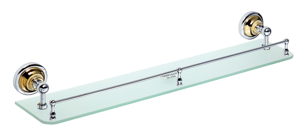 Półka szklana z relingiem wykonana z mosiądzu, pokryta chromem w wykończeniu chrom - złoto. Szkło mleczne.