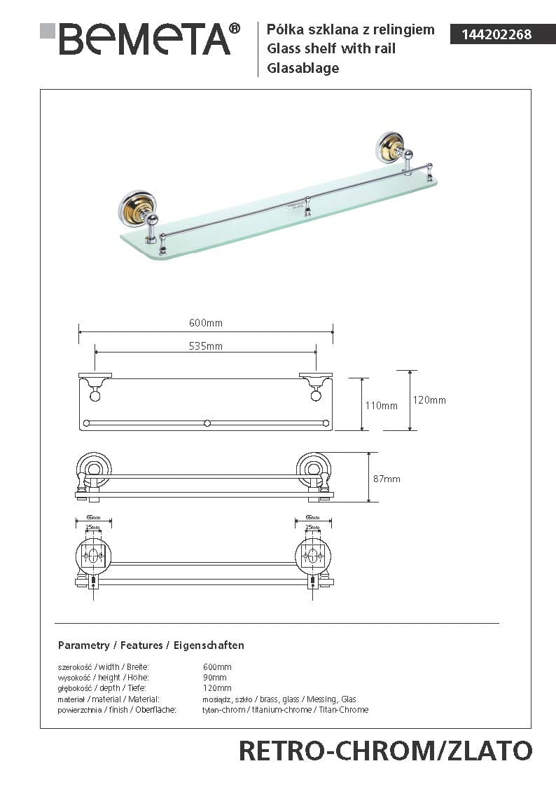 Półka szklana z relingiem 60 cm chrom - złoto RETRO 144202268 Bemeta