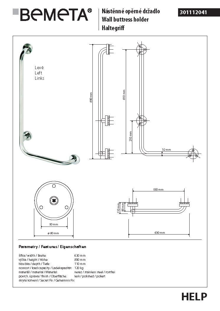 Poręcz kątowa ścienna lewa 89 x 63 cm stal nierdzewna HELP 301112041 Bemeta wymiary