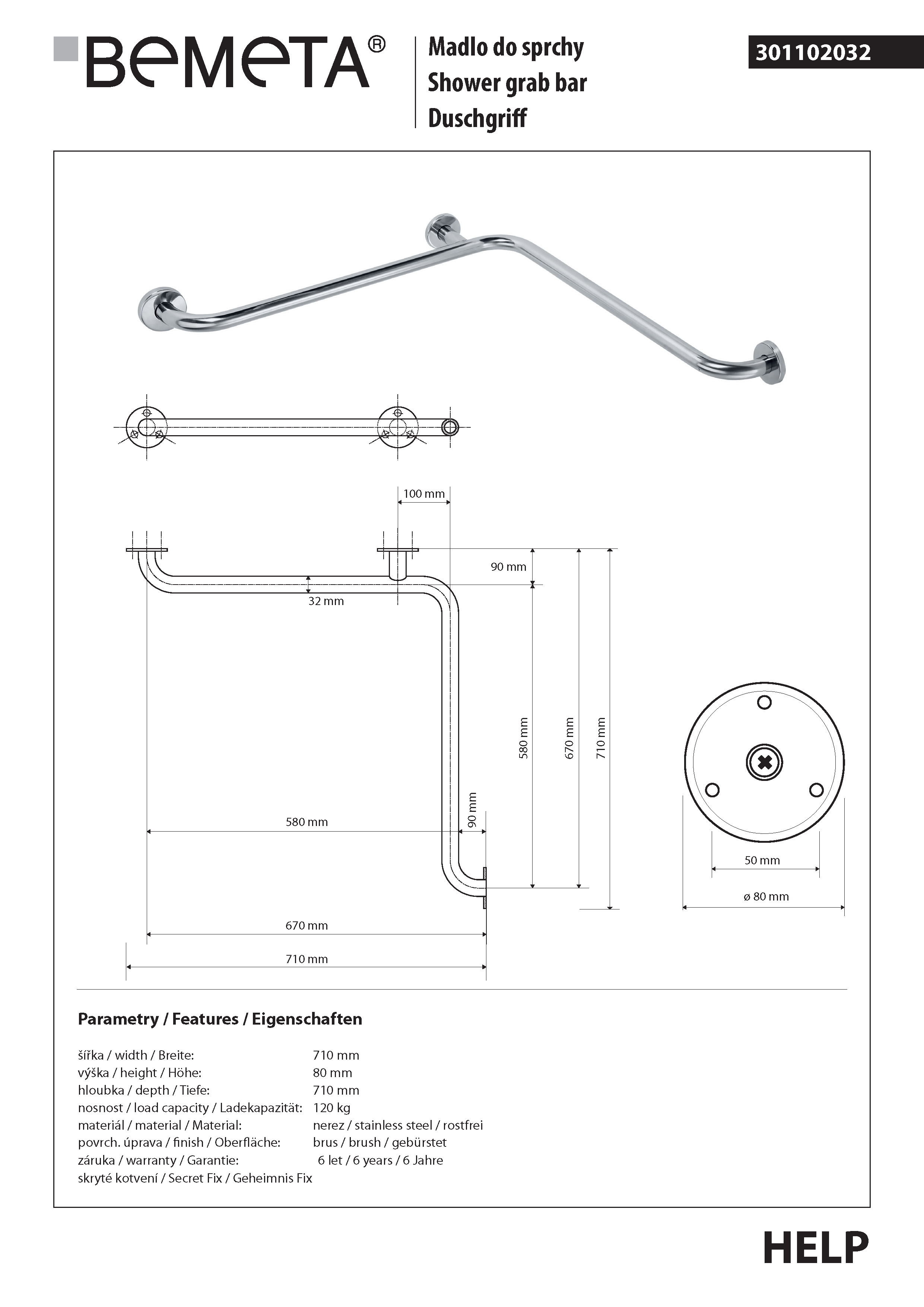 Poręcz pod prysznic stal nierdzewna szczotkowana HELP 301102032 Bemeta wymiary