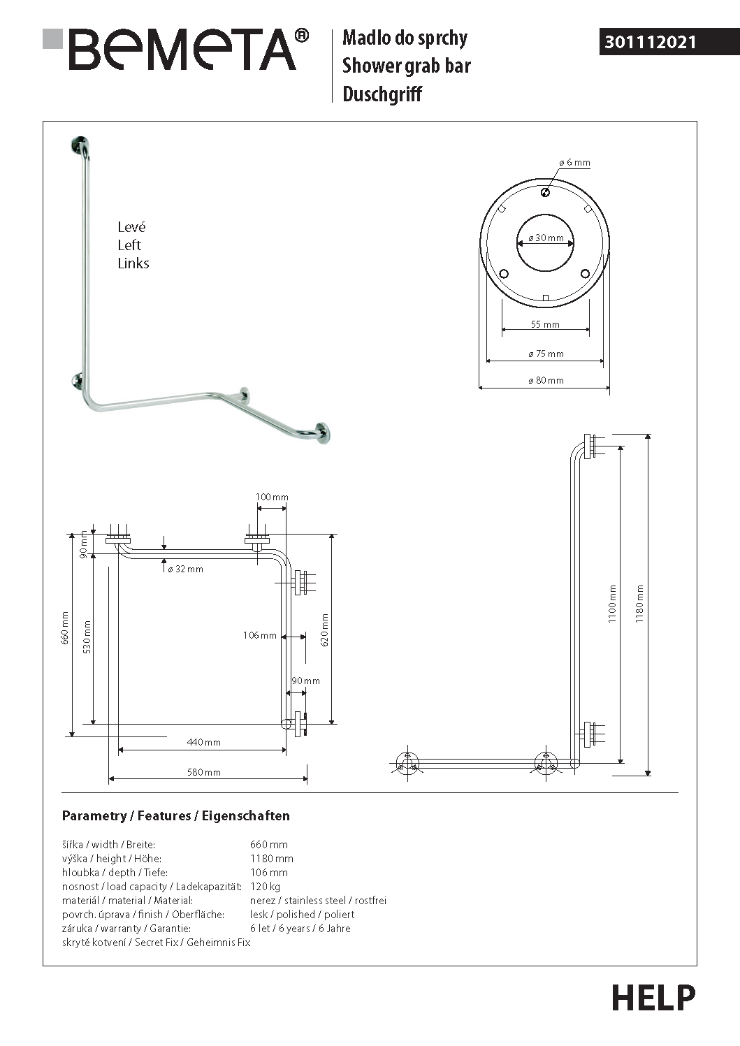 Poręcz łazienkowa pod prysznic z pionową podporą stal nierdzewna HELP lewa 301112021 Bemeta
