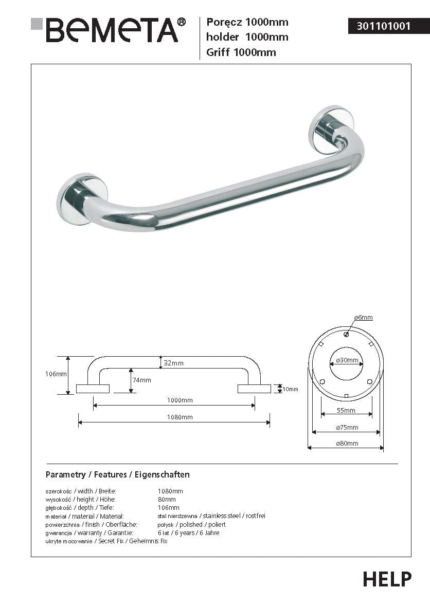 Poręcz prosta 100 cm stal nierdzewna HELP 301101001 Bemeta wymiary