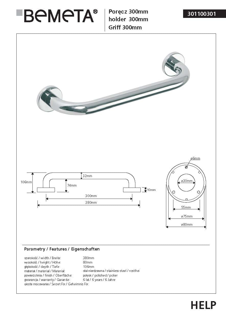Poręcz prosta 30 cm stal nierdzewna HELP 301100301 Bemeta wymiary