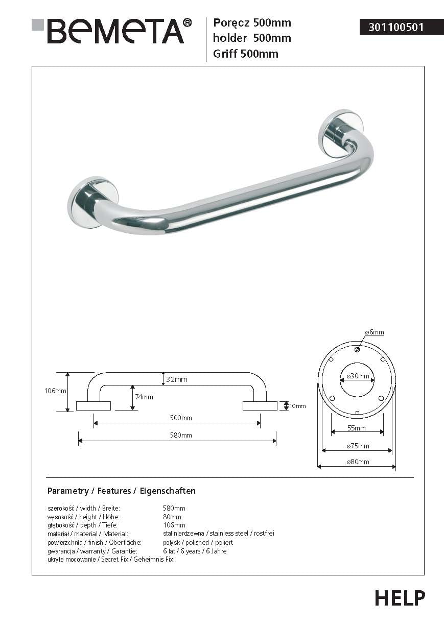 Poręcz prosta 50 cm stal nierdzewna HELP 301100501 Bemeta wymiary