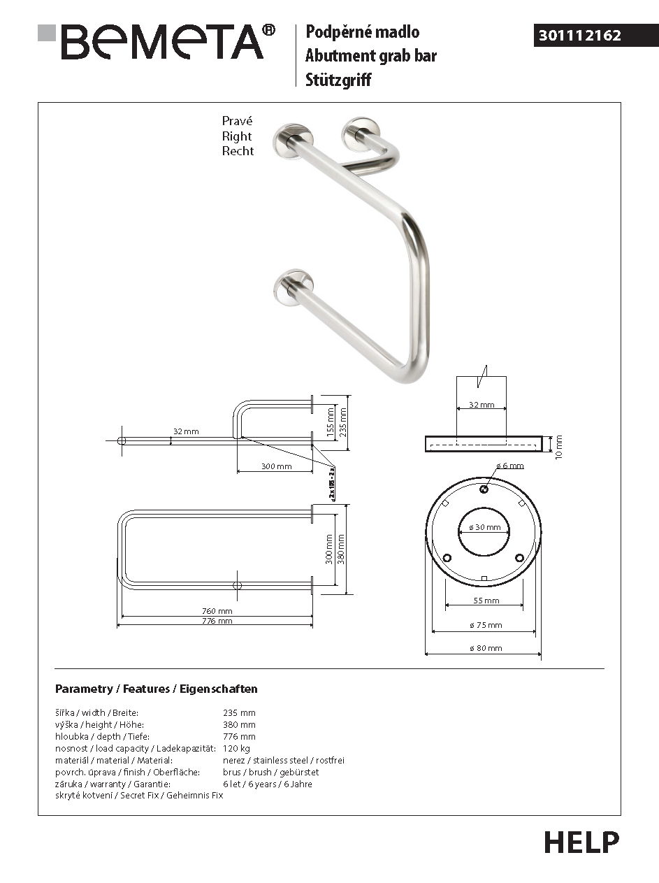 Poręcz umywalkowa prawa 77,6 cm stal nierdzewna szczotkowana HELP 301112162 Bemeta wymiary