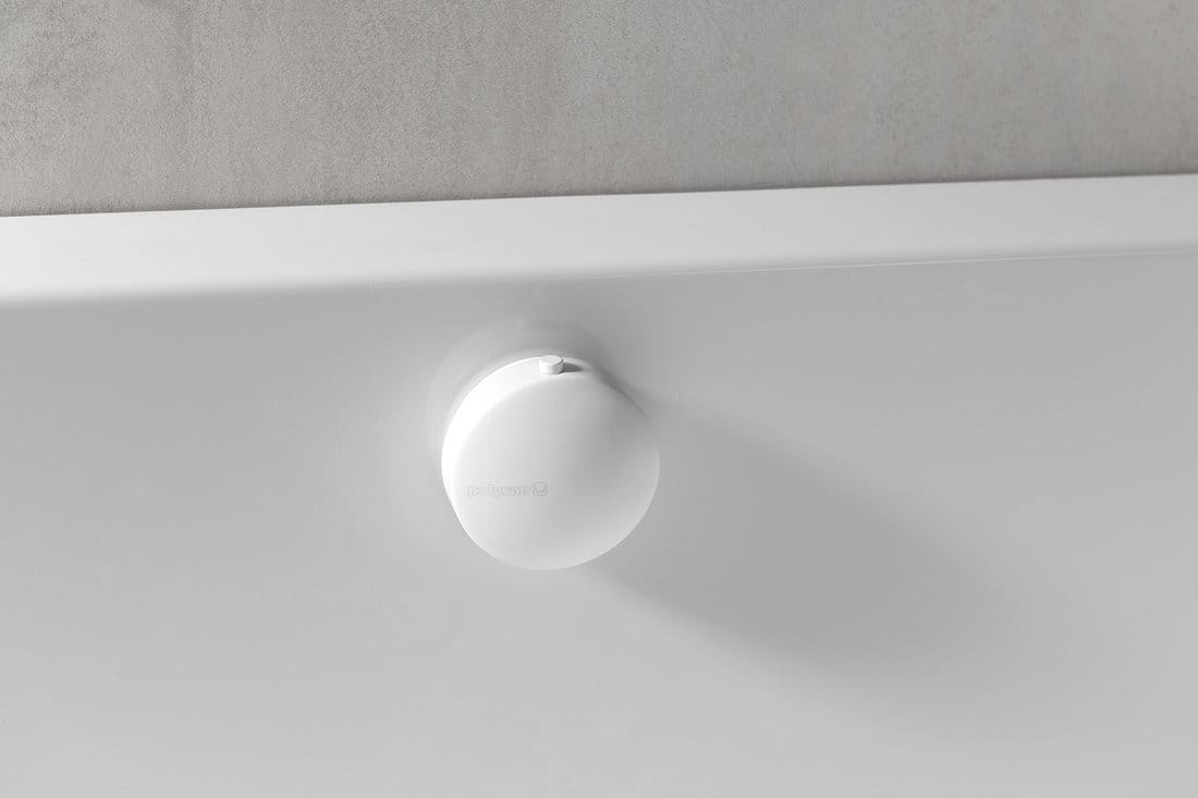 Automatyczny syfon do wanny bez napełniania, w kolorze białym. Sterowanie korkiem syfonu odbywa się za pomocą pokrętła zakrywającego przelew.