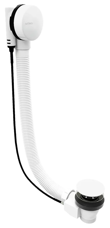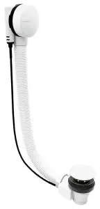 Automatyczny syfon do wanny bez napełniania, w kolorze białym. Sterowanie korkiem syfonu odbywa się za pomocą pokrętła zakrywającego przelew.