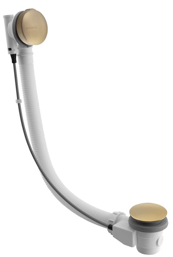 Automatyczny syfon do wanny bez napełniania, w kolorze złotym matowym. Sterowanie korkiem syfonu odbywa się za pomocą pokrętła zakrywającego przelew.