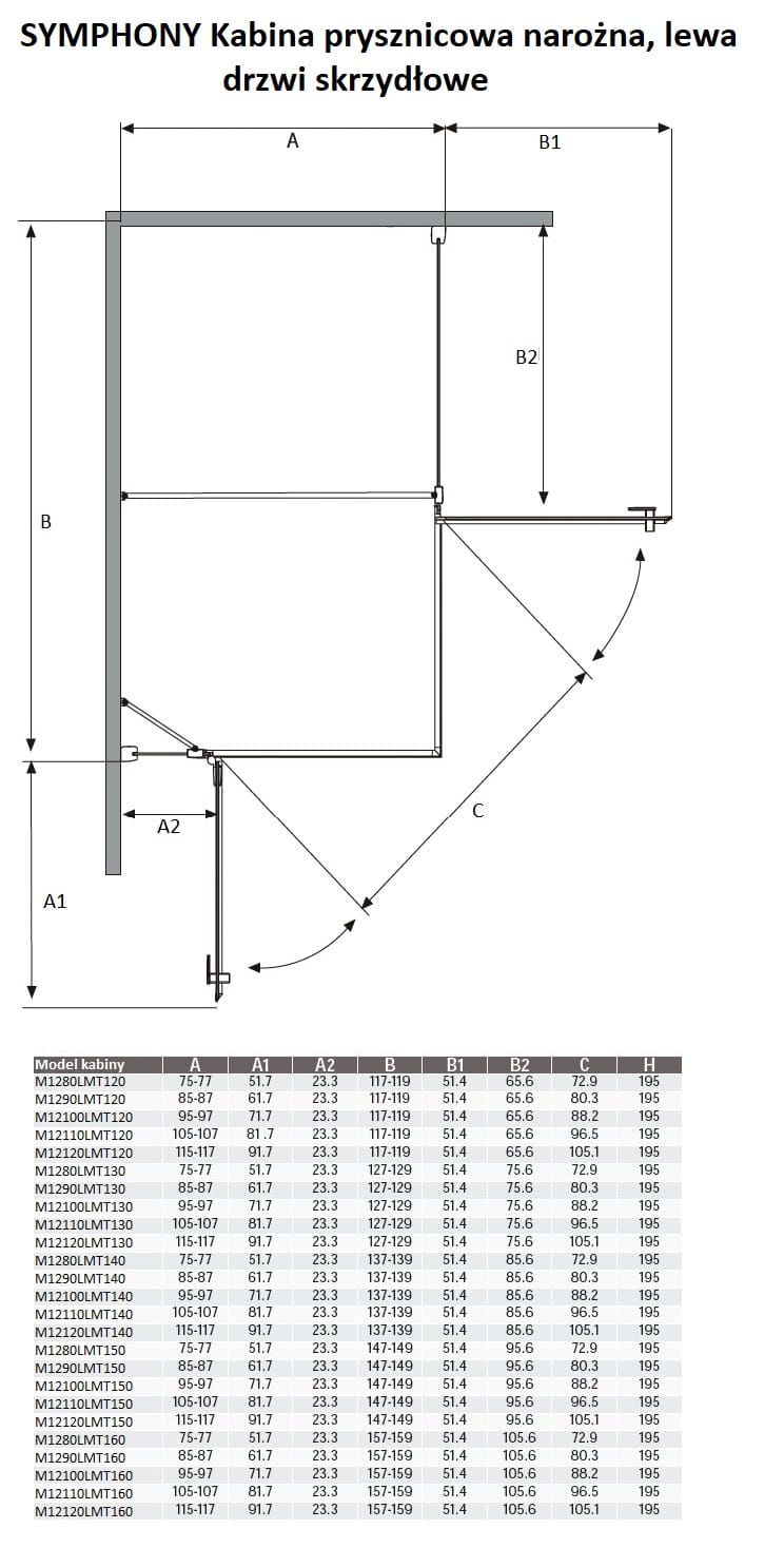 SYMPHONY Kabina prysznicowa narożna prostokątna, lewa 120x100x195 cm drzwi skrzydłowe M12100LMT120 Sanotechnik