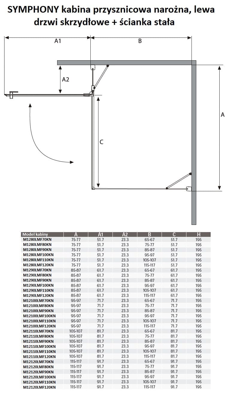 - drzwi lewe M1280L, wymiar montażowy: 75-77 cm