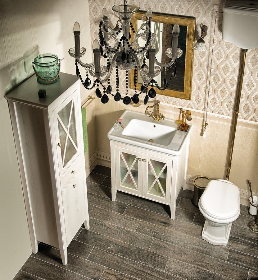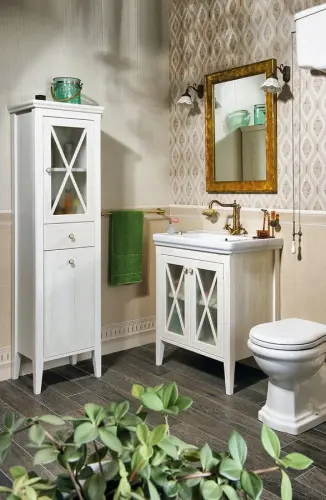 Klasyczny kształt, przeszklone drzwiczki, z 1 szufladą w środkowej części i koszem na bieliznę w dolnej części szafki tworzą praktyczną i funkcjonalną szafkę łazienkową która ozdobi każde wnętrze.