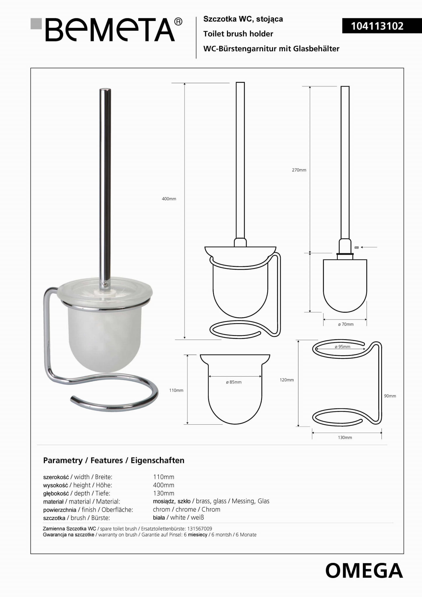 Szczotka WC stojąca biała OMEGA 104113102 Bemeta wymiary