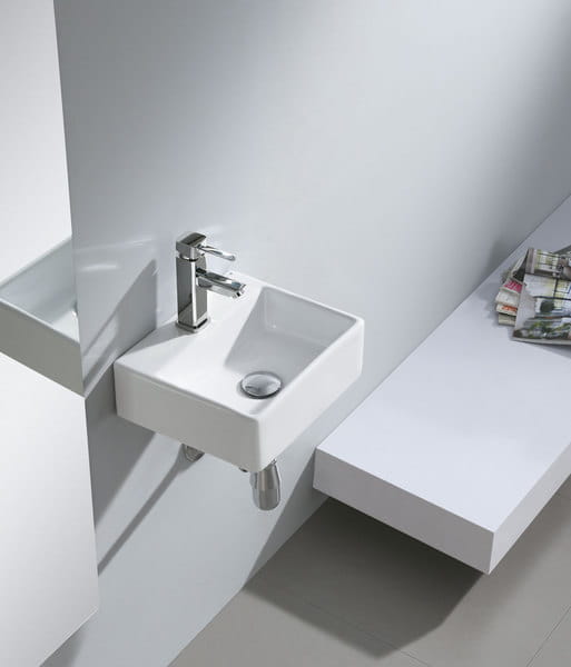 Umywalka wisząca z możliwością postawienia jej na blacie. Z jednym otworem na baterię bez przelewu.