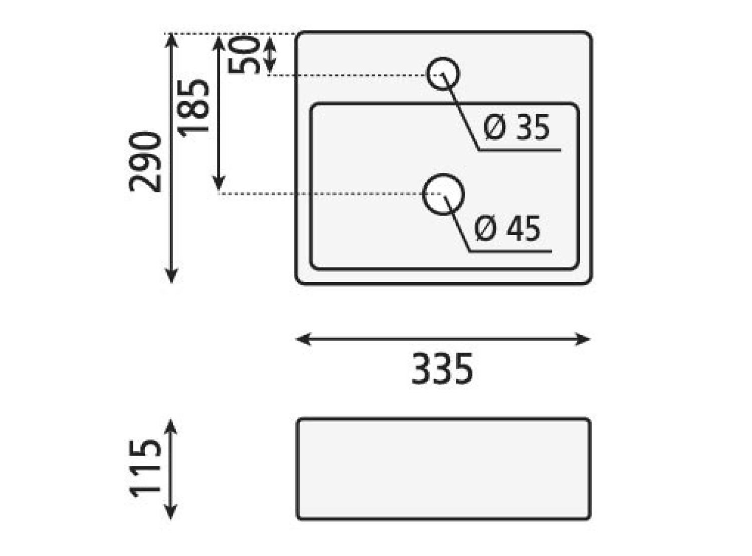 - Kształt umywalki prostokątna