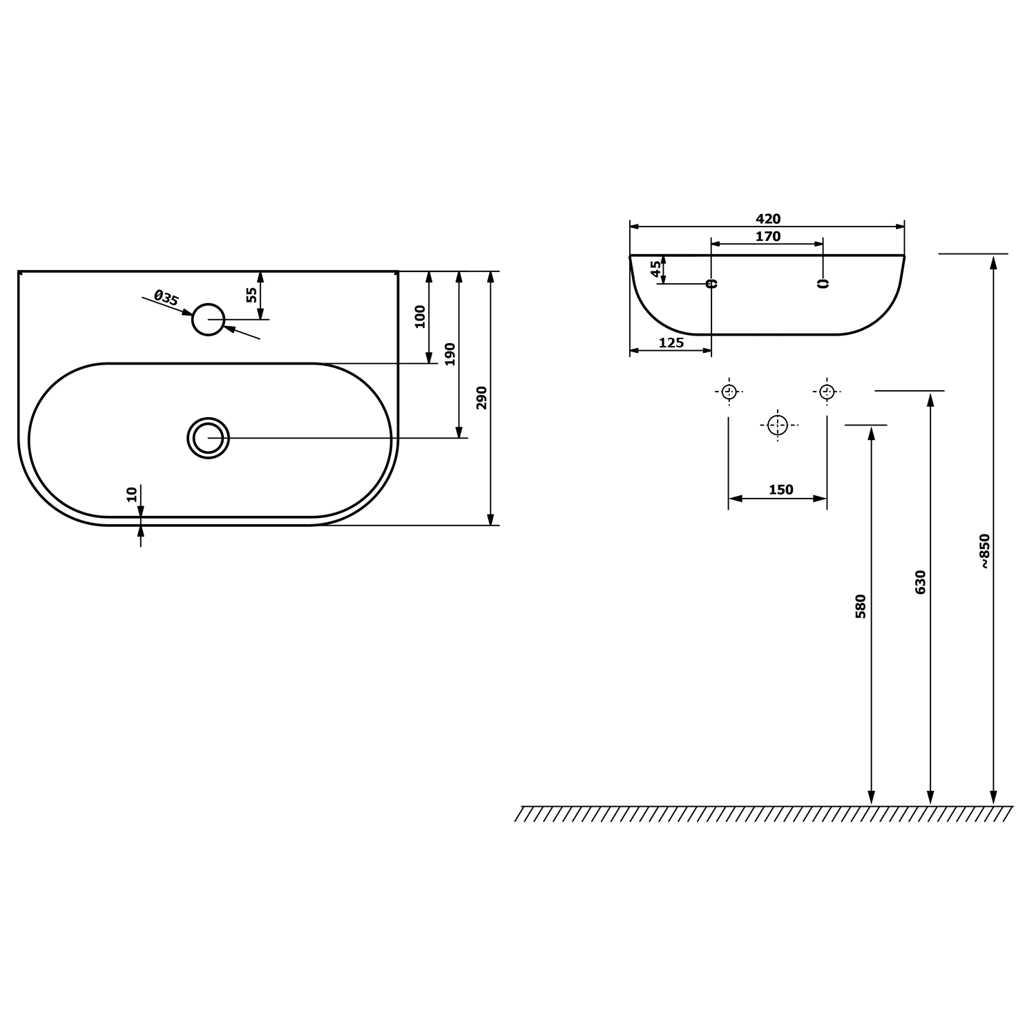 - Kształt umywalki półokrągła