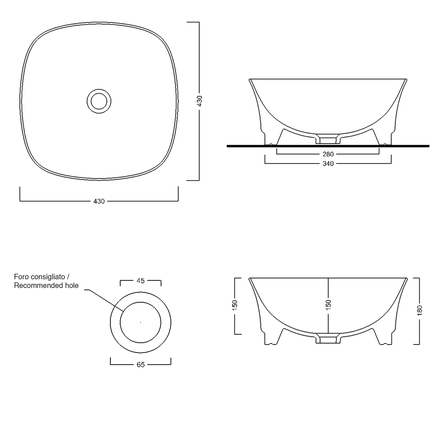 Umywalka kwadratowa koloru białego bez przelewu i otworu na baterię o wymiarach 43x18x43 cm.