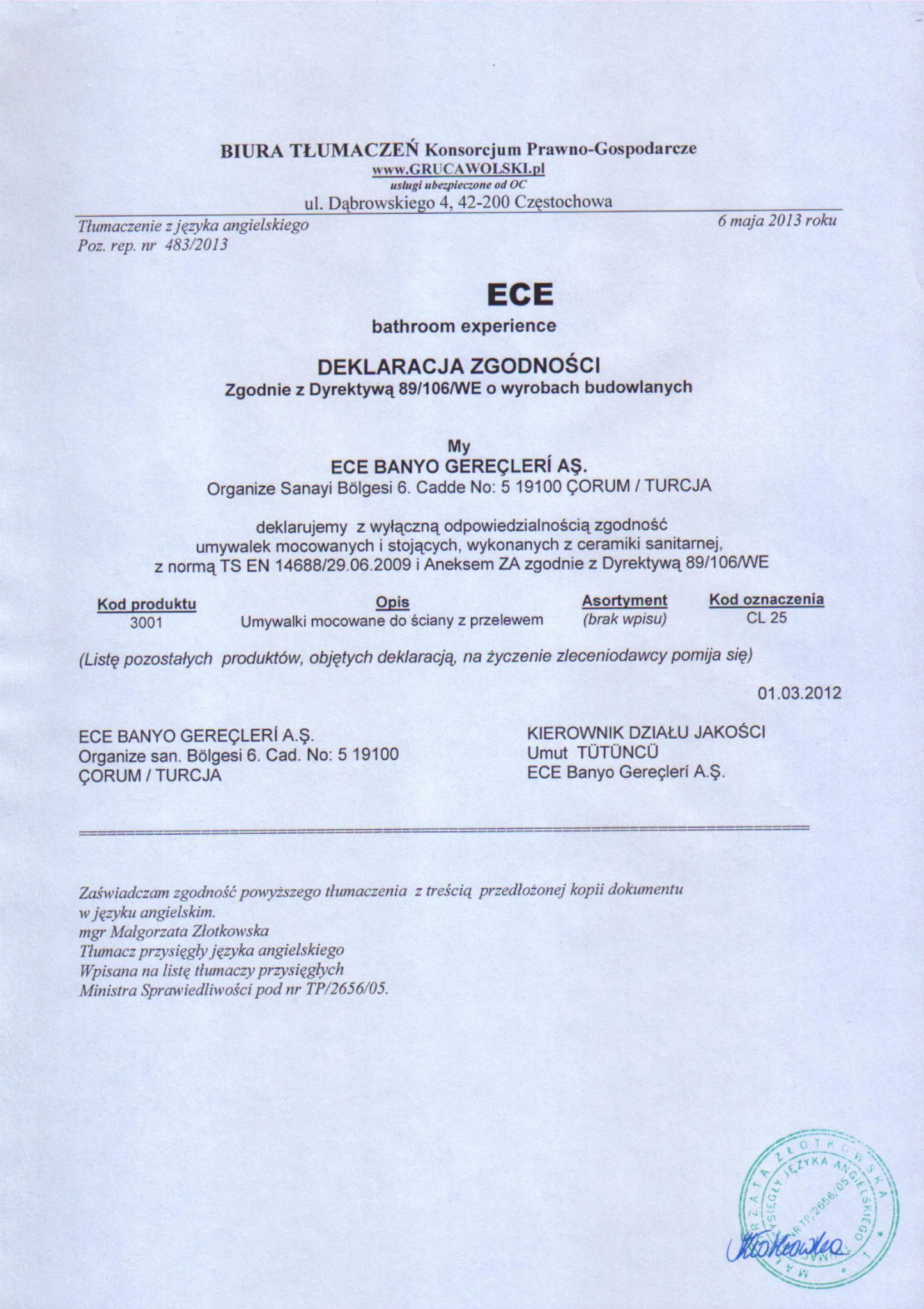 Umywalka dla niepełnosprawnych 59x45,5 cm (3001) 10TP60060 - deklaracja zgodności ECE