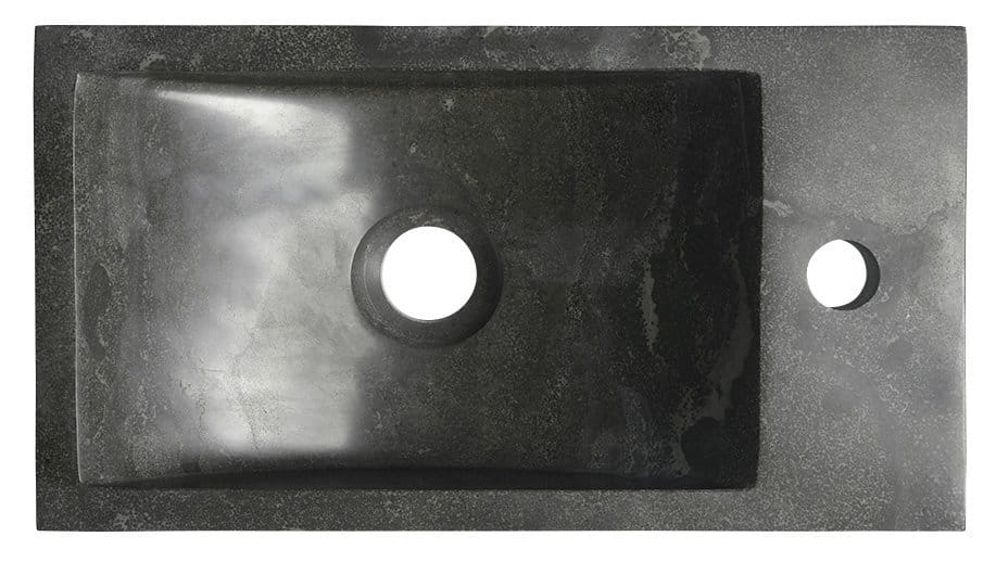 Umywalka kamienna koloru antracyt bez przelewu z otworem na baterię po prawej stronie o wymiarach 40x10x22 cm.