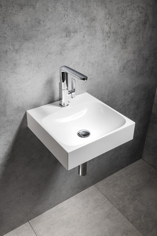 Umywalka kwadratowa wykonana z kompozytu w kolorze białym.