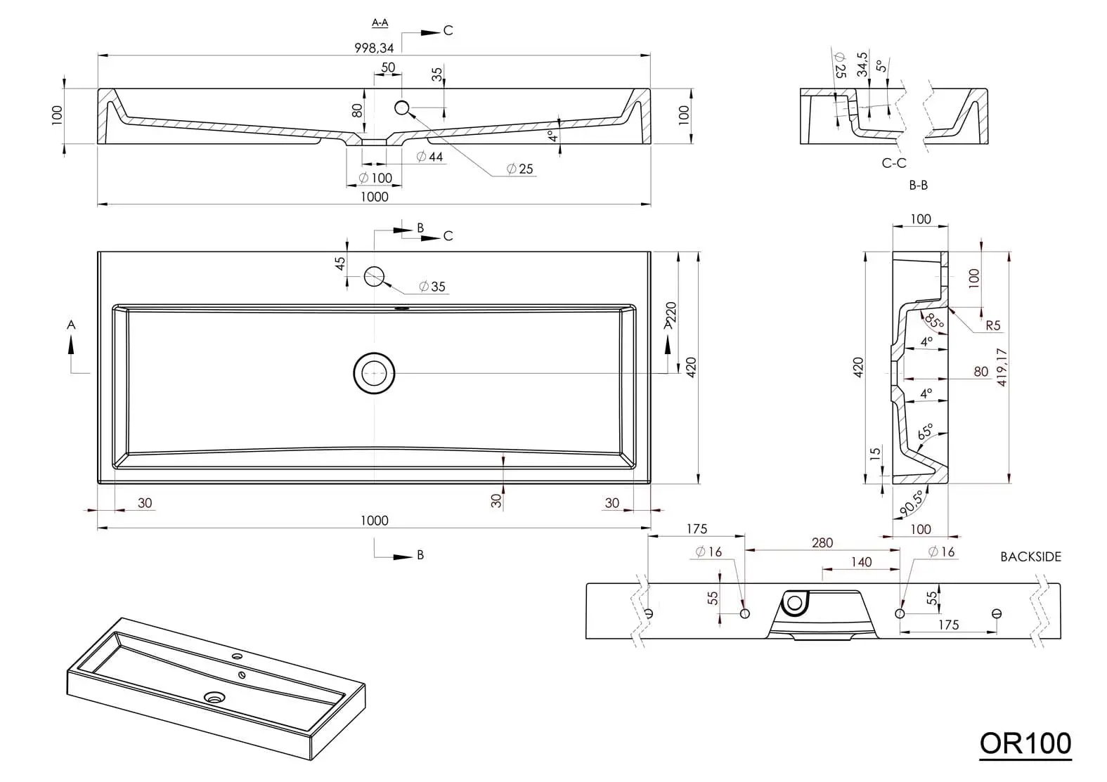 ORINOKO Umywalka kompozytowa 100x42 cm OR100 - rysunek techniczny