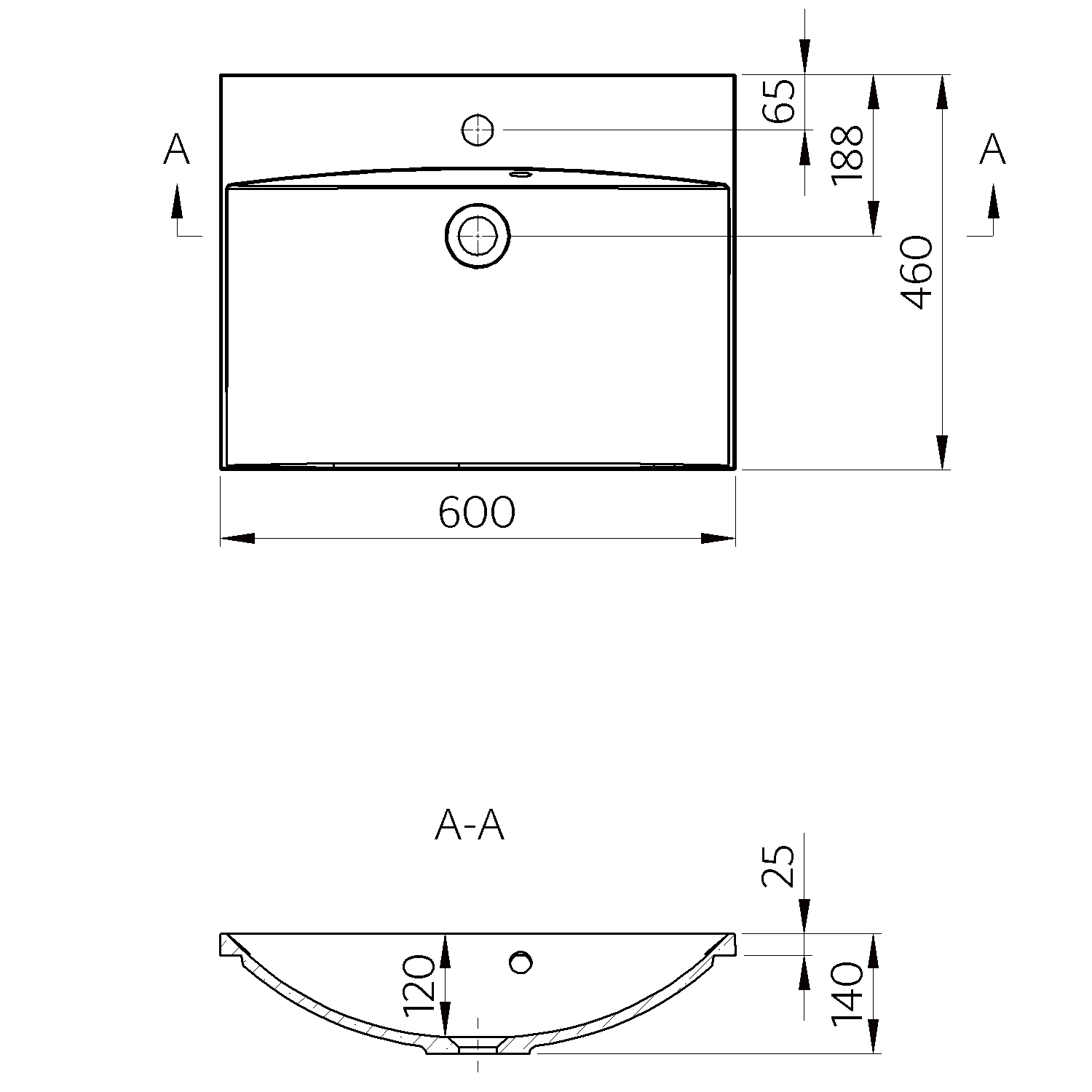 Umywalka kompozytowa meblowa koloru białego z przelewem i otworem na baterię o wymiarach 60x46 cm.