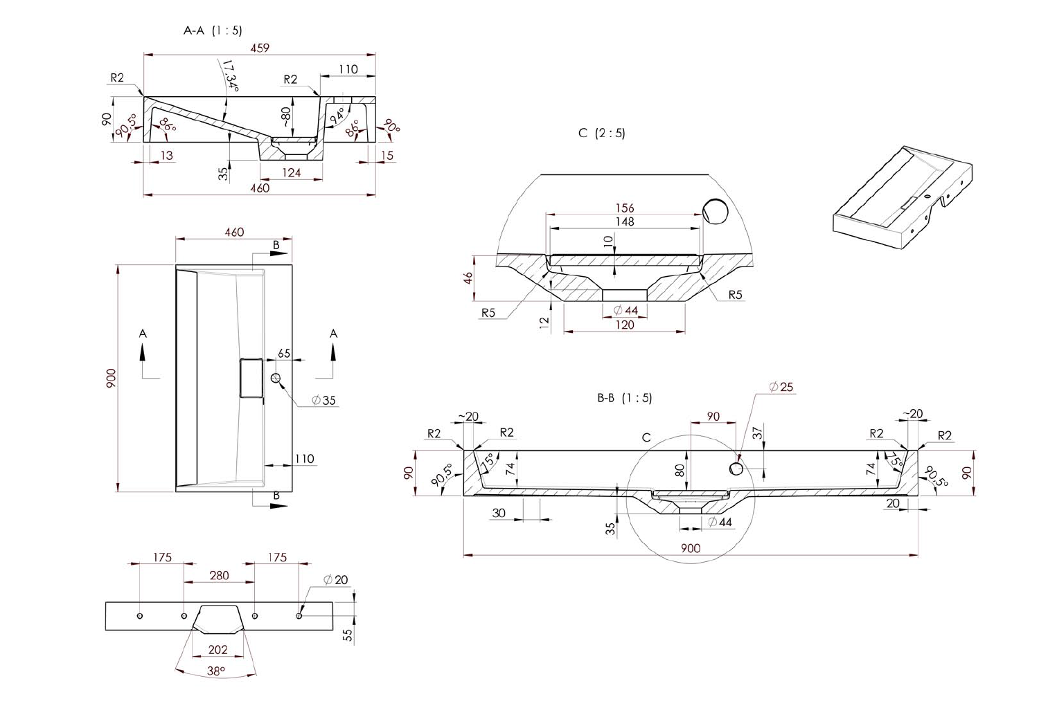 AMUR Umywalka kompozytowa 90x46 cm 55032 - rysunek techniczny