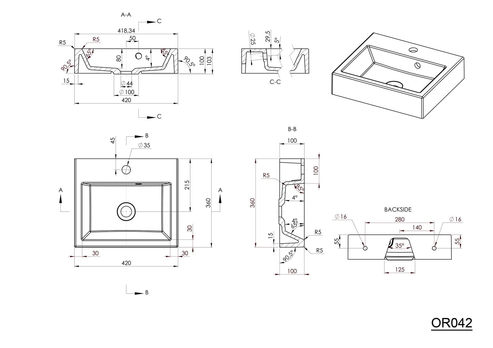 ORINOKO Umywalka kompozytowa 42x36 cm OR042 - rysunek techniczny