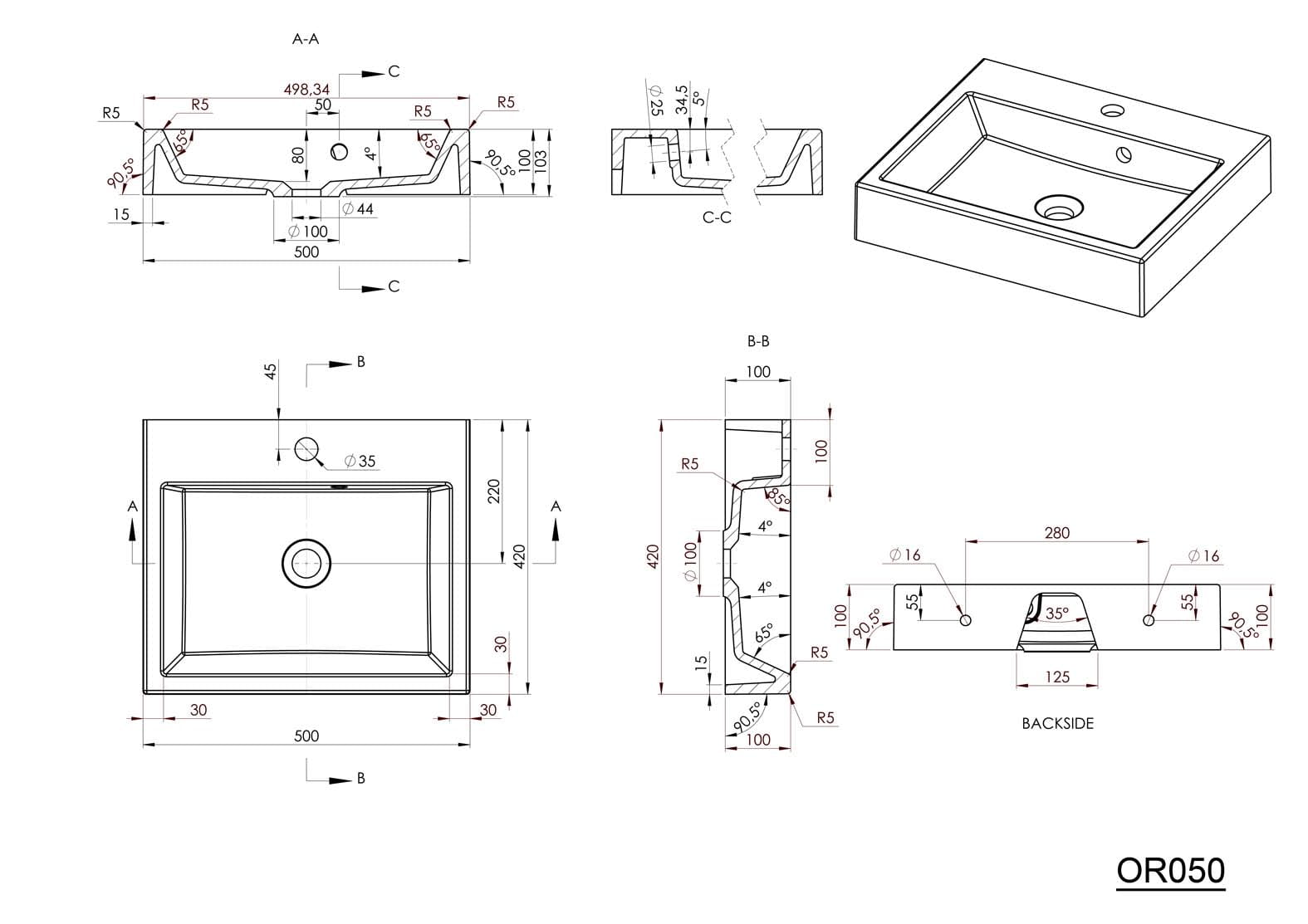 ORINOKO Umywalka kompozytowa 50x42 cm OR050 - rysunek techniczny