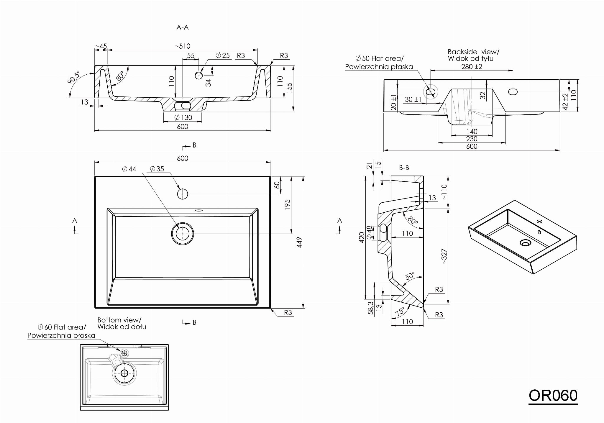 ORINOKO Umywalka kompozytowa 60x45 cm OR060 - rysunek techniczny