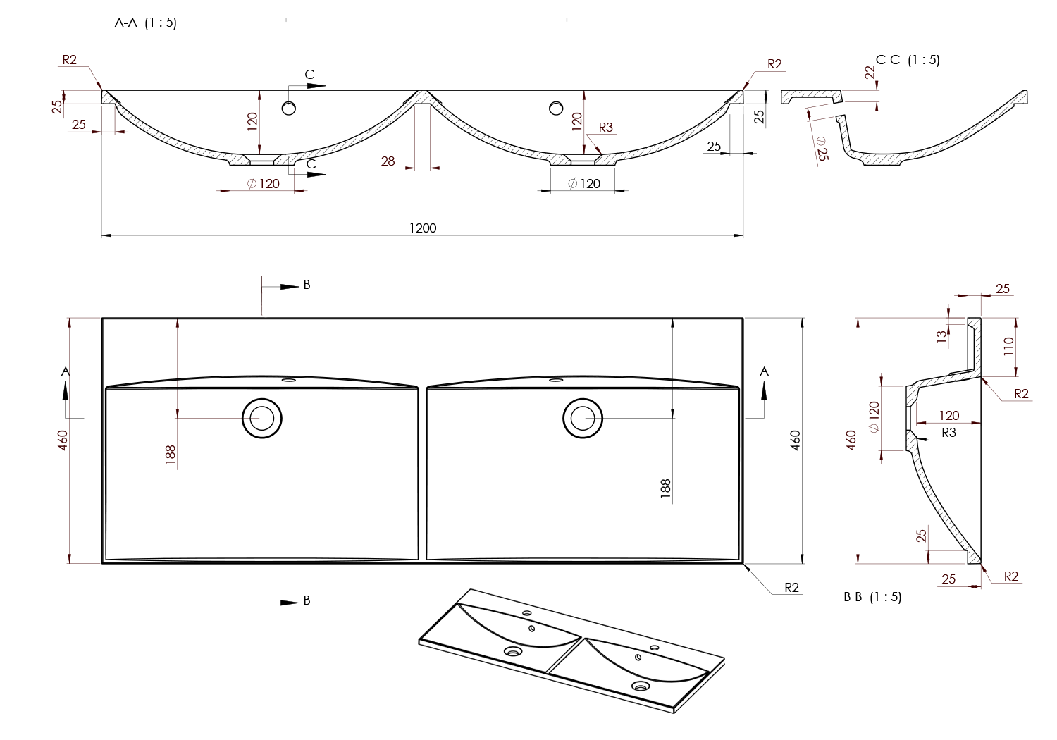 Umywalka kompozytowa podwójna 120 x 46 cm biały bez otworu MARIA MA120-0 Sapho