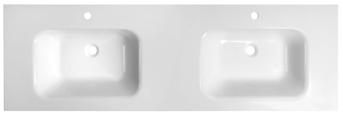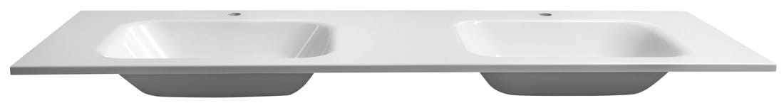 Umywalka podwójna w kolorze białym, z 2 otworami na baterię i bez przelewu. O wymiarach 161x14,2x51,5 cm.