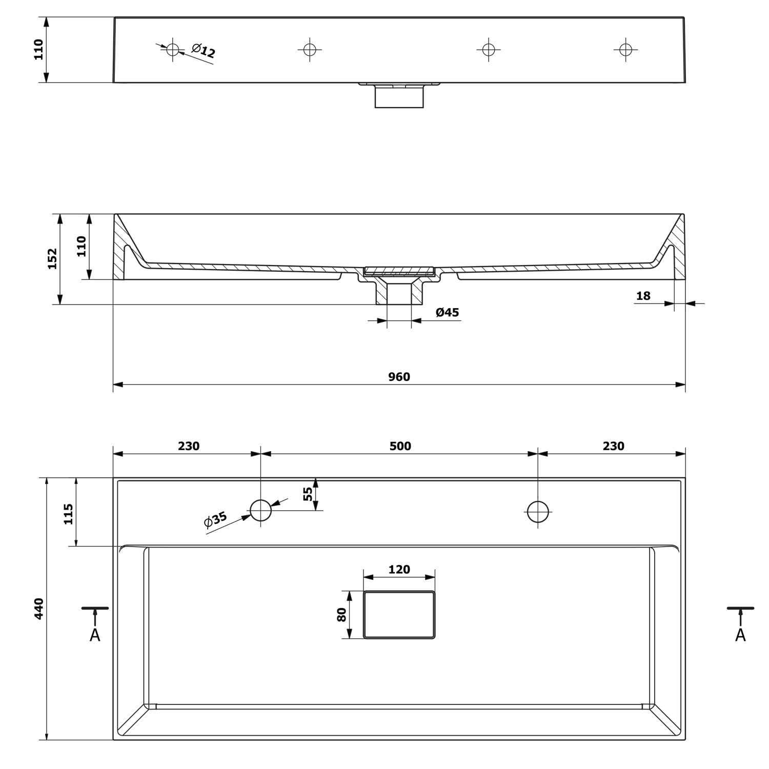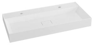 Umywalka kompozytowa koloru białego bez przelewu z dwoma otworami na baterię o wymiarach 96x11x44 cm.