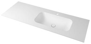 Umywalka w kolorze białym matowym, z 1 otworem na baterię i bez przelewu. O wymiarach 140x51,5 cm z blatem po lewej stronie.