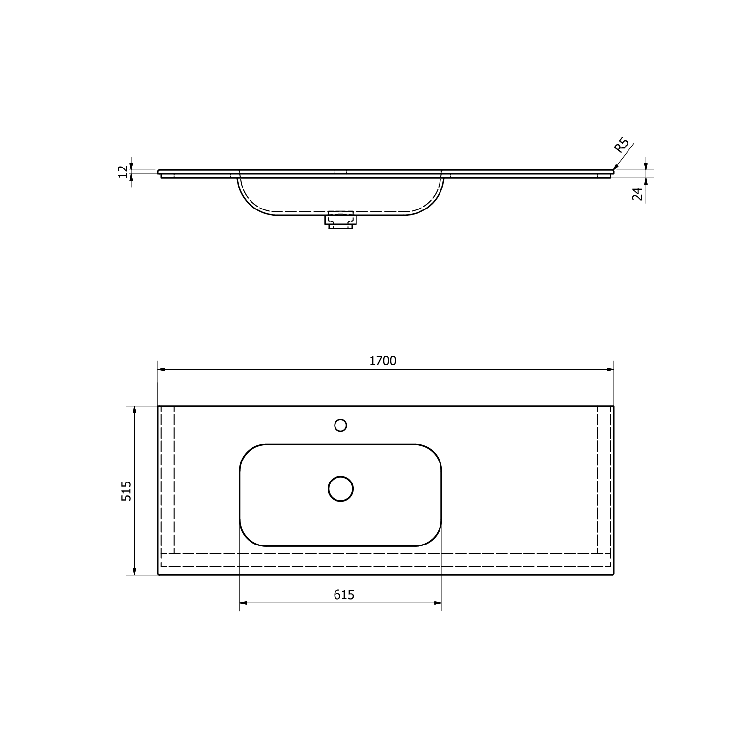 Umywalka w kolorze białym matowym, z 1 otworem na baterię i bez przelewu. O wymiarach 170x51,5 cm z blatem po prawej stronie.