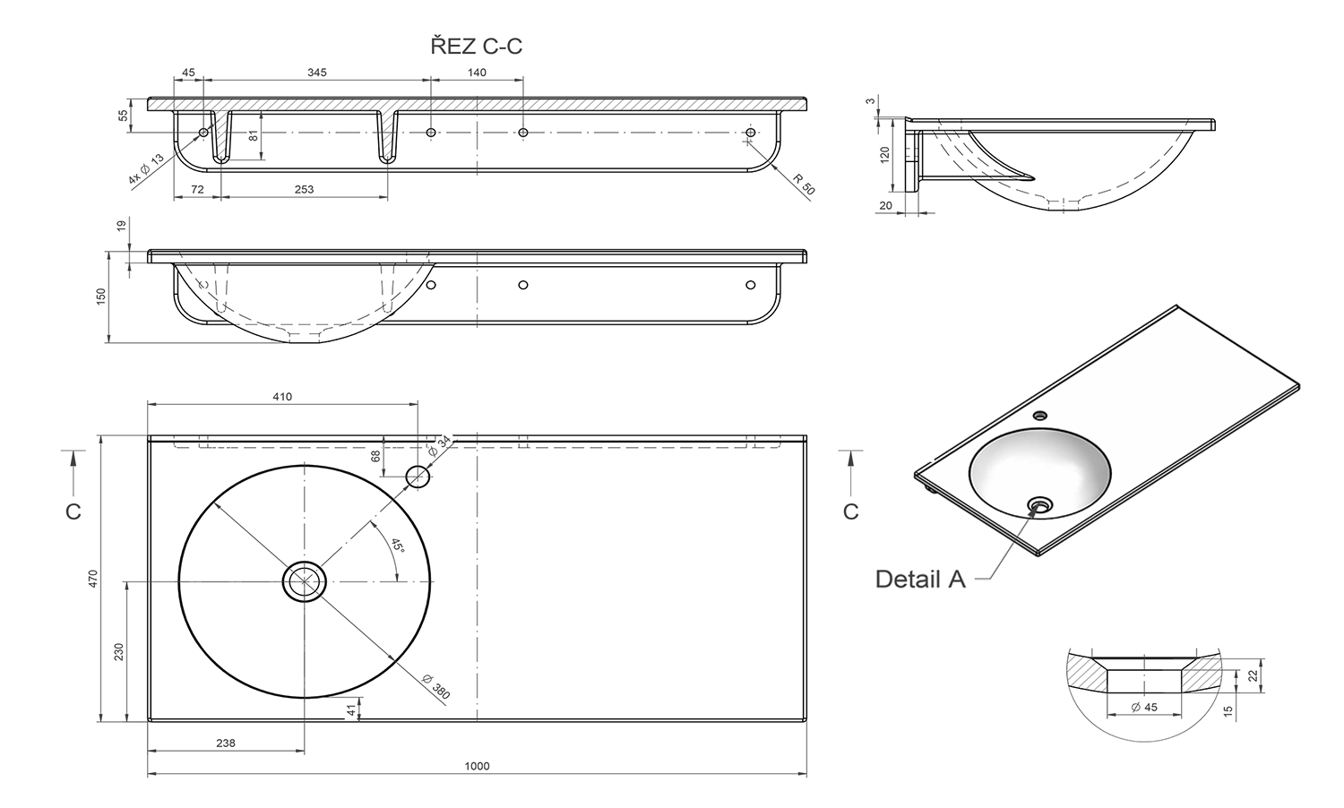- Kształt umywalki prostokątna