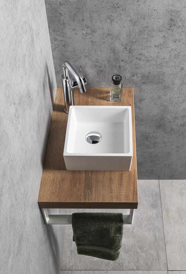 Umywalka kwadratowa wykonana z kompozytu w kolorze białym bez otworu i przelewu.