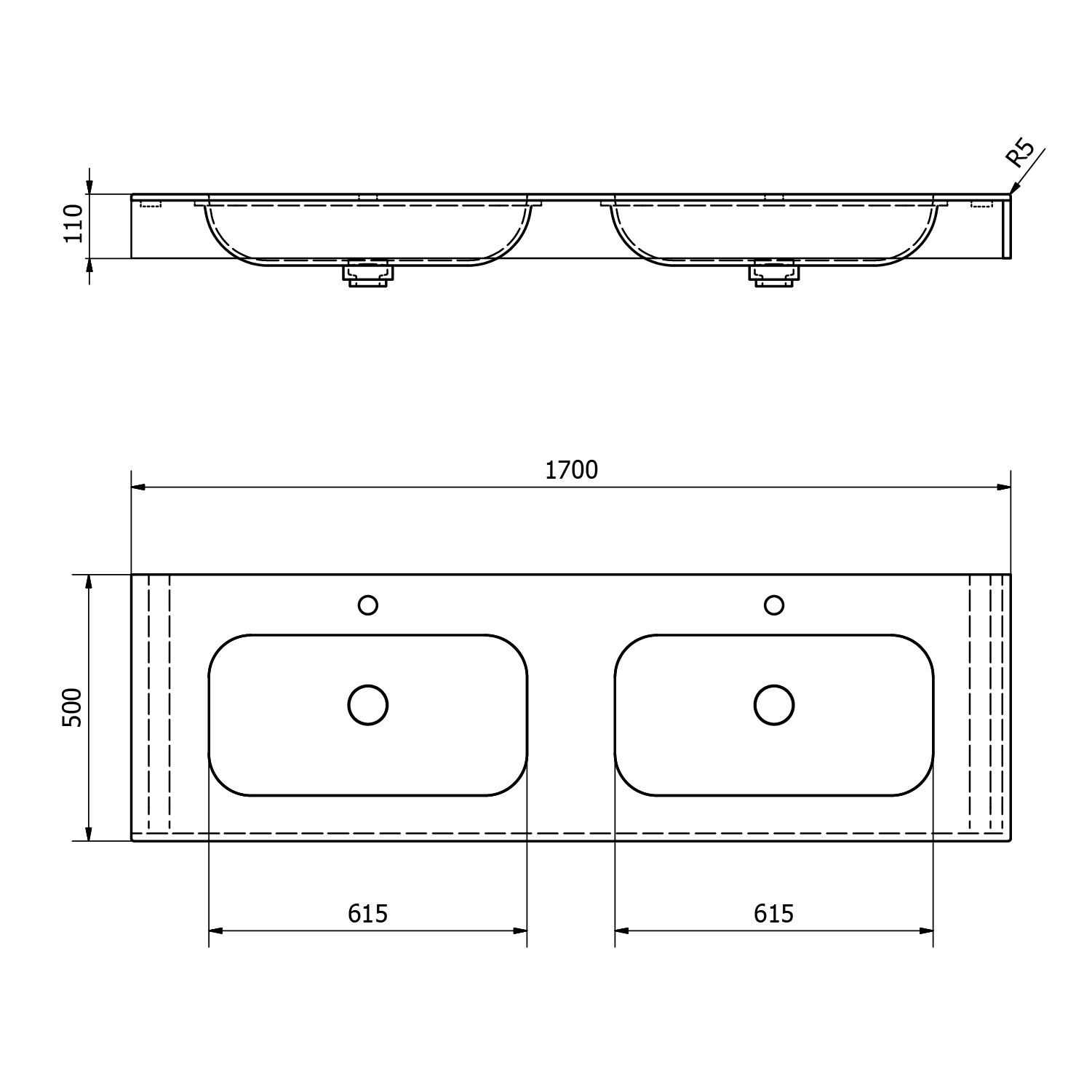 Umywalka podwójna lewa w kolorze białym matowym, z 2 otworami na baterię i bez przelewu. O wymiarach 170x50 cm.