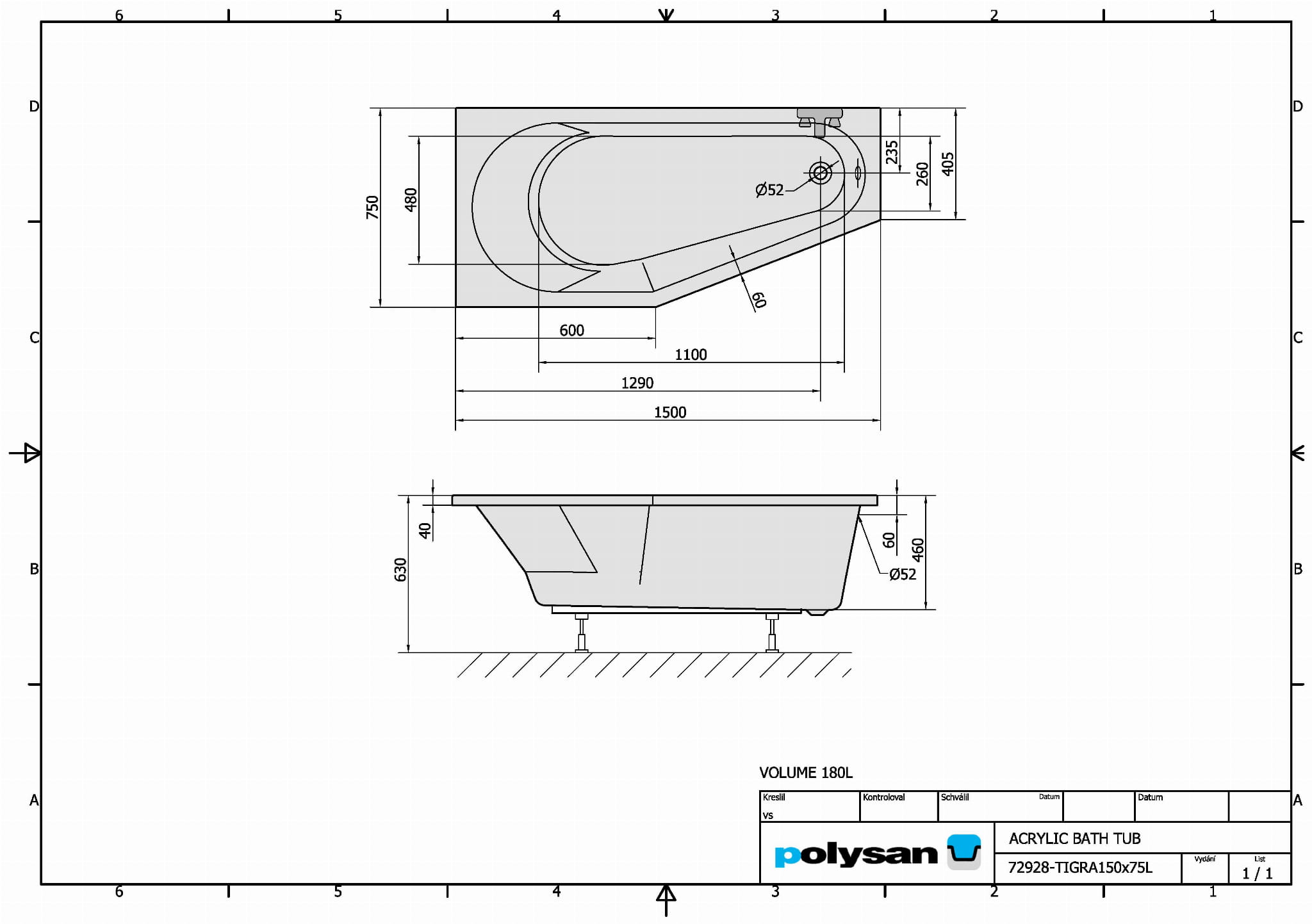 Wanna akrylowa asymetryczna 150x75 cm (lewa) TIGRA 72928 Polysan