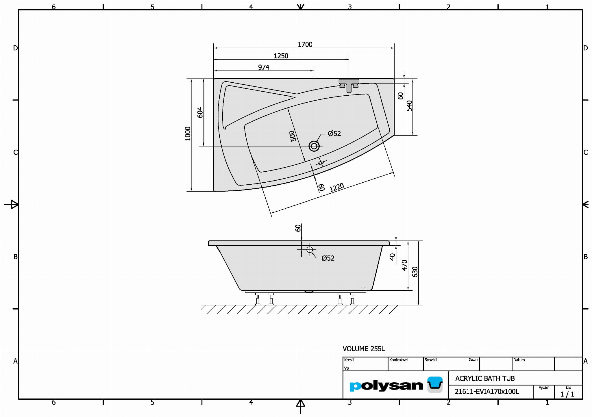 EVIA Wanna akrylowa asymetryczna 170x100 cm (lewa) 21611 rysunek techniczny