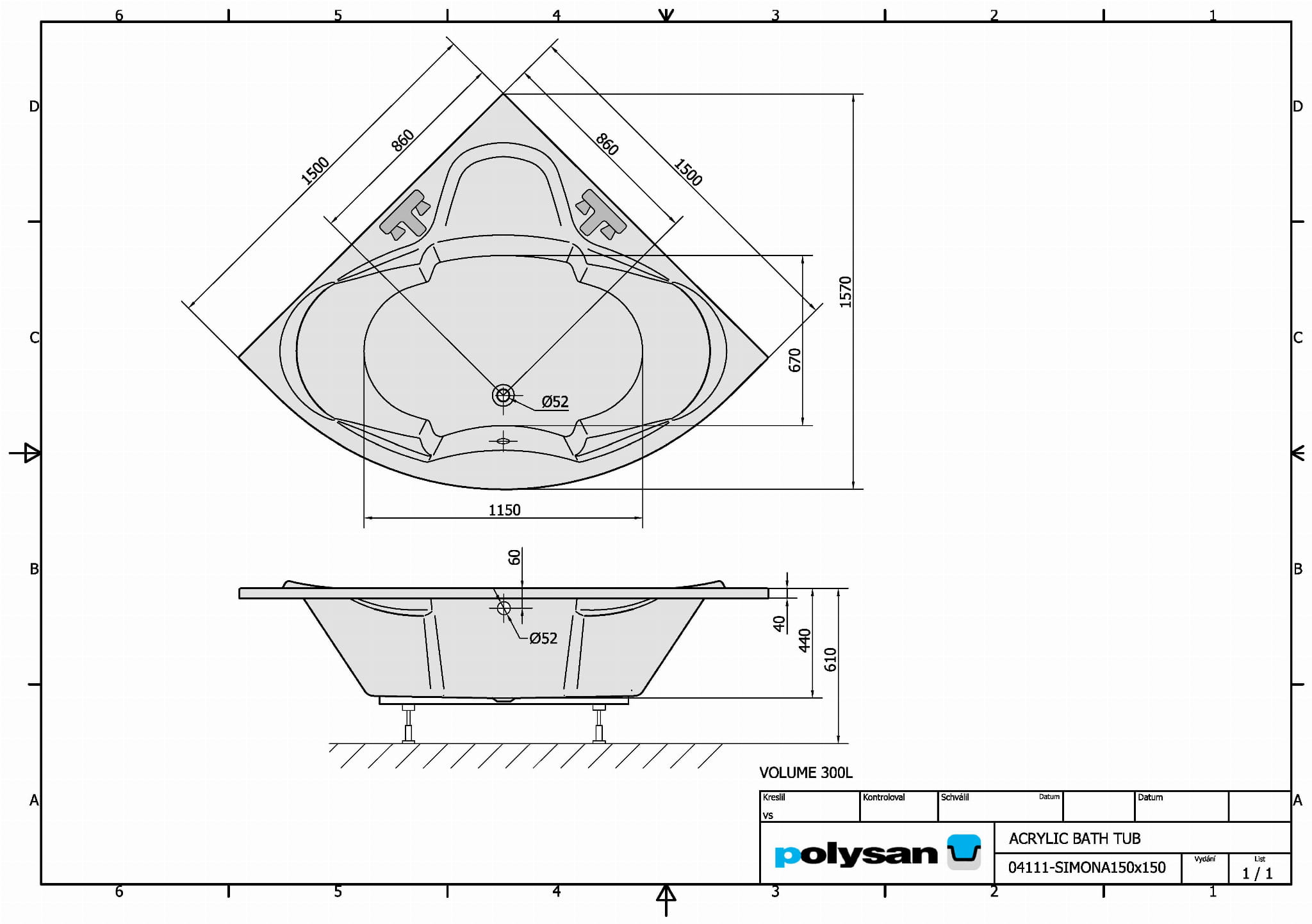 SIMONA Wanna akrylowa narożna 150x150 cm 04111 - rysunek techniczny