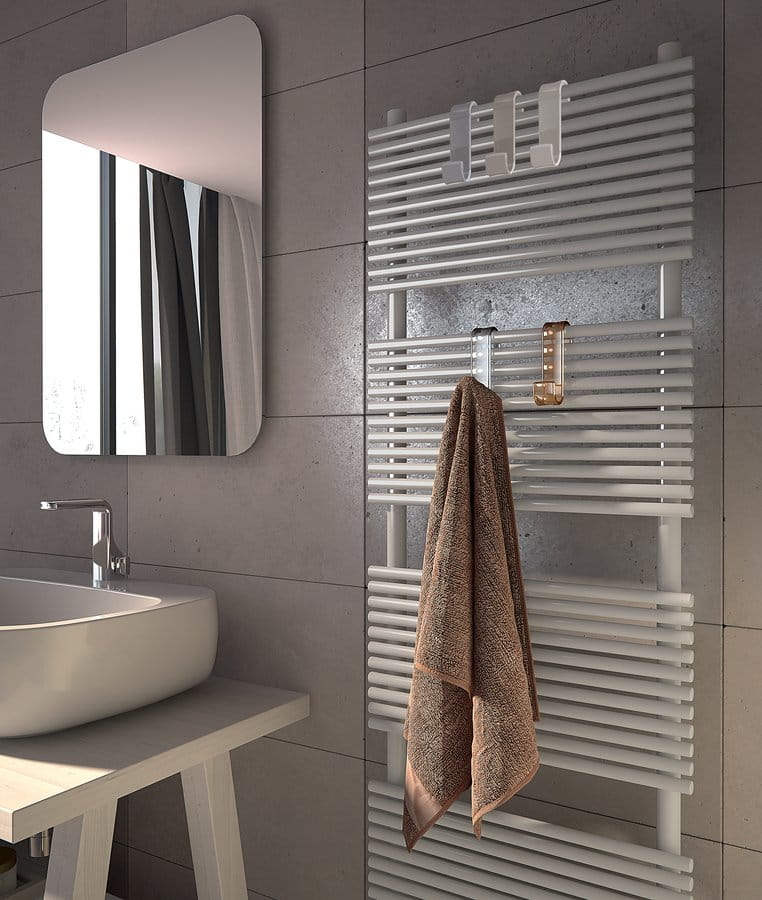 Chromowany wieszaczek zakładany na grzejnik łazienkowy, wykonany z tworzywa sztucznego.