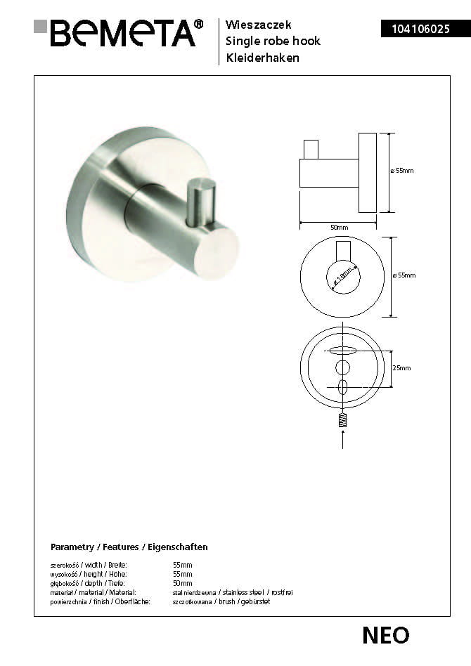 Wieszaczek NEO 104106025 Bemeta wymiary