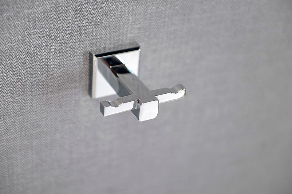 Wieszaczek podwójny, chromowany, do montażu za pomocą kołków rozporowych.