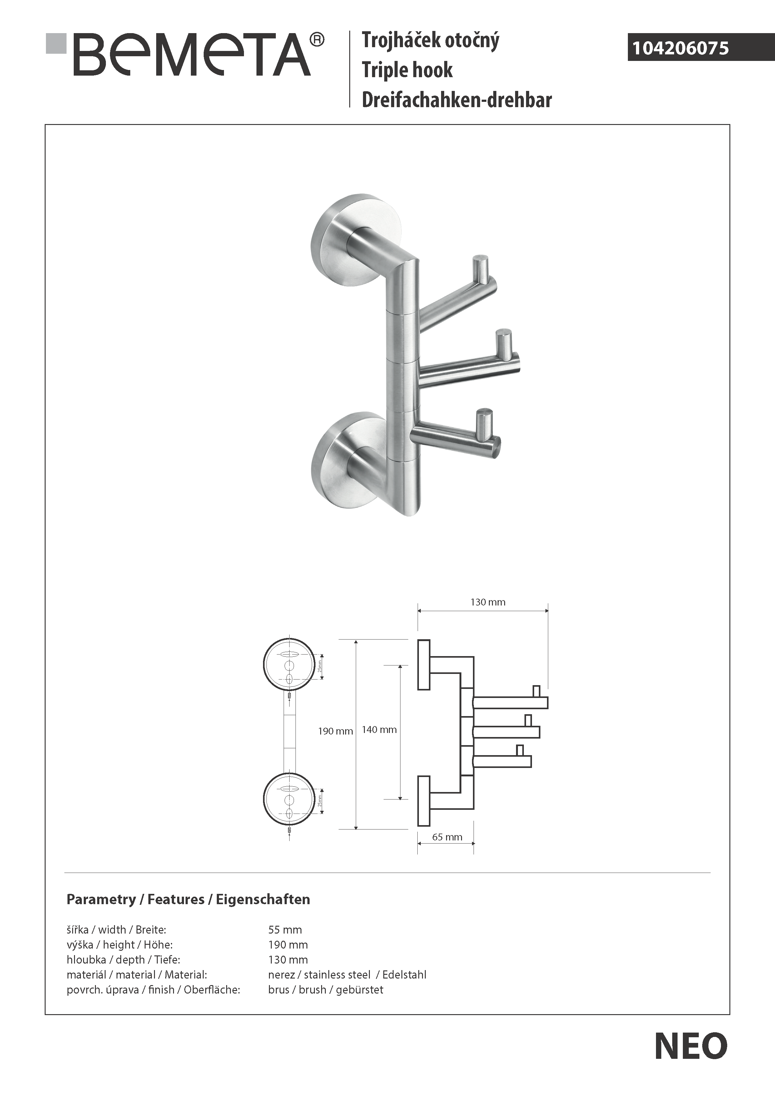 Wieszaczek potrójny obrotowy NEO 104206075 Bemeta wymiary