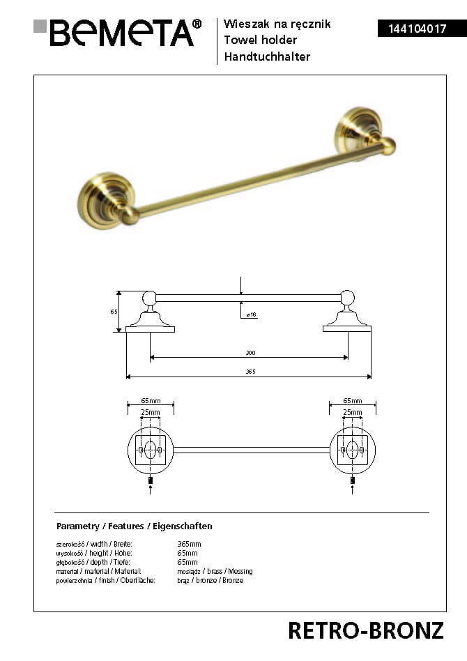 Wymiary (całkowita szerokość wraz z rozetami x głębokość): 365 x 65 mm.