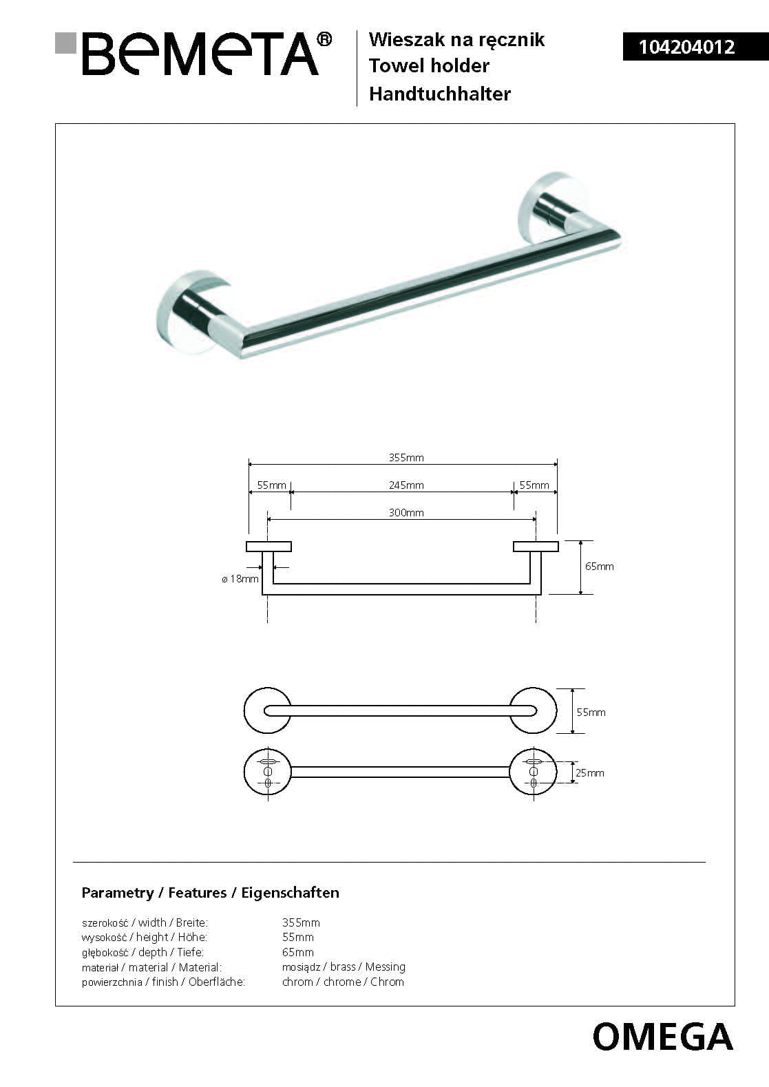 Wieszak na ręcznik 35,5 x 6,5 cm OMEGA 104204012 Bemeta wymiary