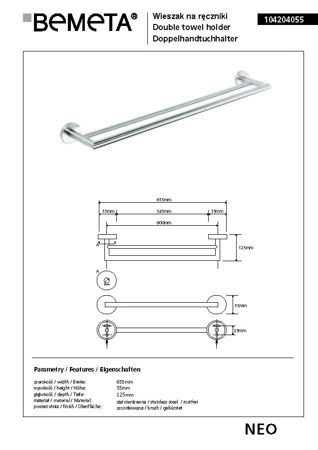 Wieszak na ręcznik podwójny 65,5 x 12,5 cm NEO 104204055 Bemeta