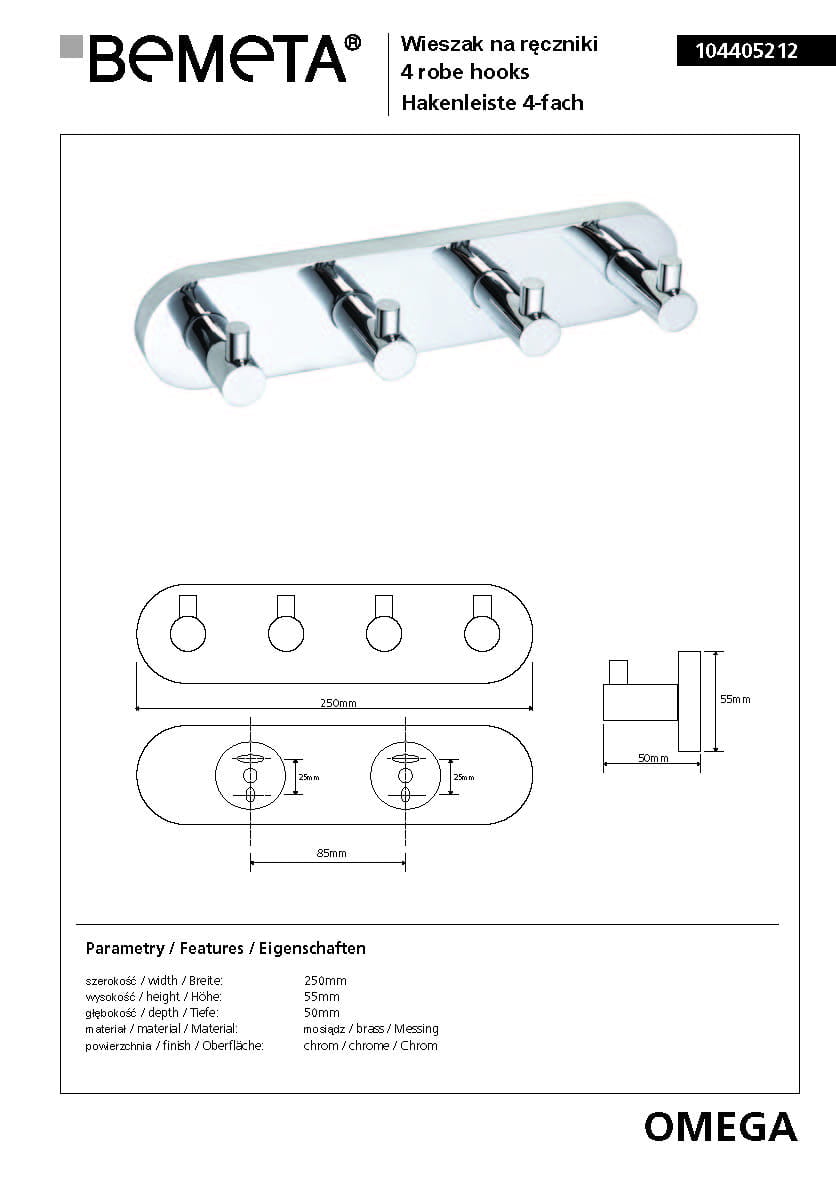 Wieszak na ręcznik z 4 haczykami OMEGA 104405212 Bemeta