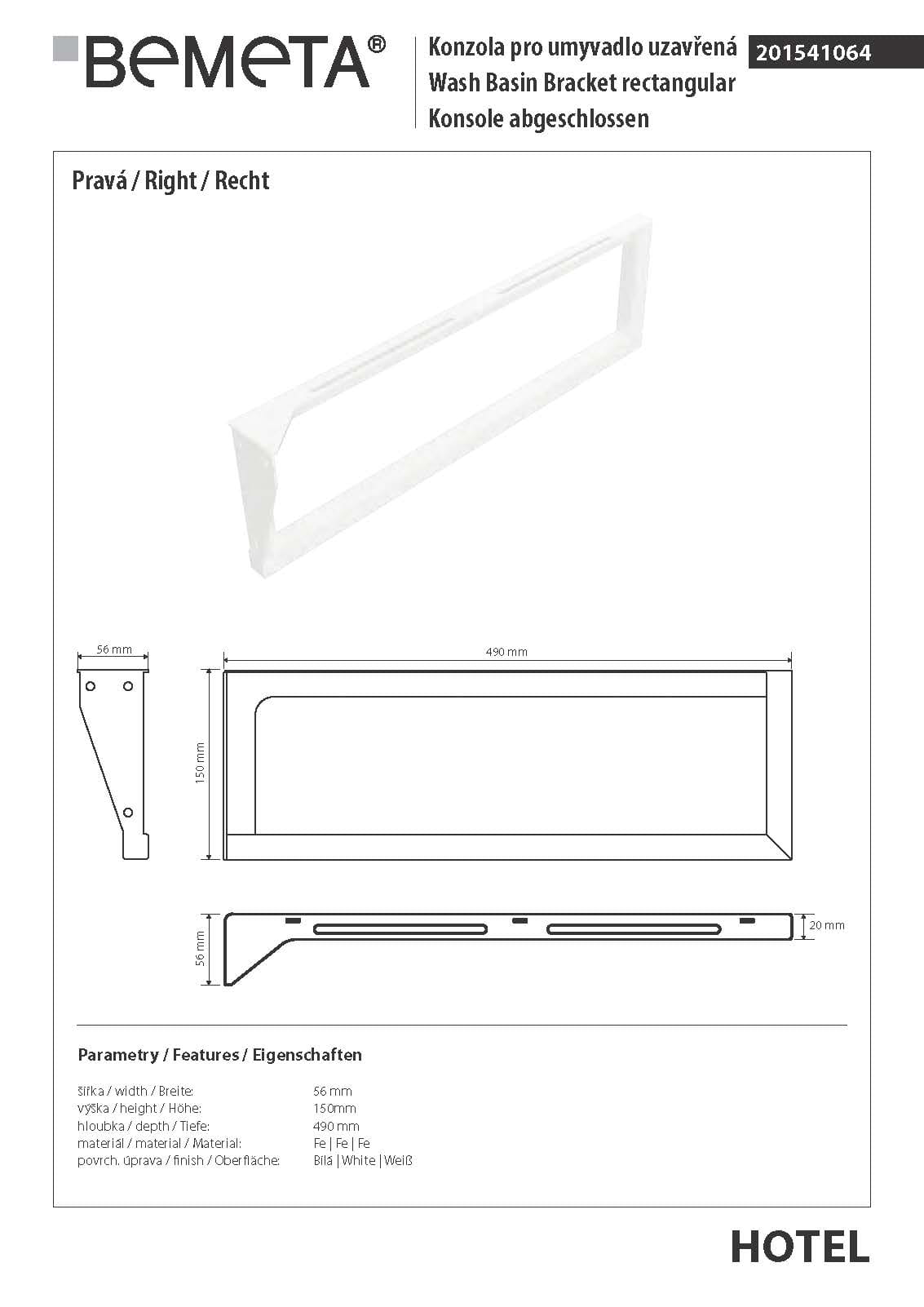 Wspornik do umywalki / reling 49 cm prawy biały 201541064 Bemeta